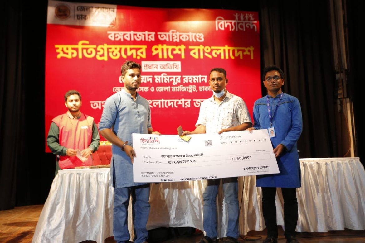 বঙ্গবাজারের অগ্নিদুর্ঘটনার সময় থেকে বিদ্যানন্দ ফাউন্ডেশন অনলাইনে ক্ষতিগ্রস্তদের পাশে দাঁড়াতে সবাইকে আহ্বান জানান। নগদ টাকা অনুদানের পাশাপাশি আগুনে পোড়া কাপড় অকশন মূল্যে কিনে হলেও সেসব মানুষের পাশে দাঁড়ানোর জন্য আহ্বান জানানো হয়। সে আহ্বানে সাড়া দিয়ে সমাজের বিভিন্ন সেলিব্রেটি, গুণীজন, মন্ত্রী, প্রতিষ্ঠান সহ সর্বস্তরের সাধারণ মানুষ অংশ নেয়। বিদ্যানন্দের এই অনলাইন ক্যাম্পেইনে প্রায় দুই কোটি টাকা অনুদান সংগৃহীত হয়। এর মধ্যে গত মাসে ১ কোটি টাকা এবং আজ ৭০ লক্ষ টাকা তুলে দেওয়া হয়েছে। তৃতীয় ধাপে আরও কিছু কর্মচারীর হাতে বাকী ৩০ লক্ষ টাকা তুলে দেওয়া হবে।উল্লেখ্য জেলা প্রশাসনের সাথে সমন্বয় করে বিদ্যানন্দ ফাউন্ডেশন সহায়তা প্রদানের কাজটি করছে।